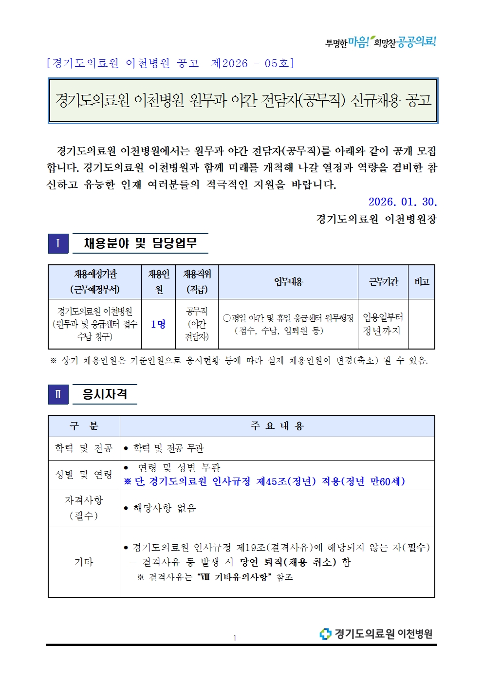 - 직무 내용: 평일 야간 및 휴일 응급의료센터 원무 행정 (접수, 수납, 입·퇴원 수속, 제증명 발급 등)