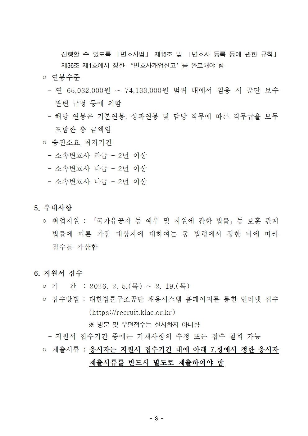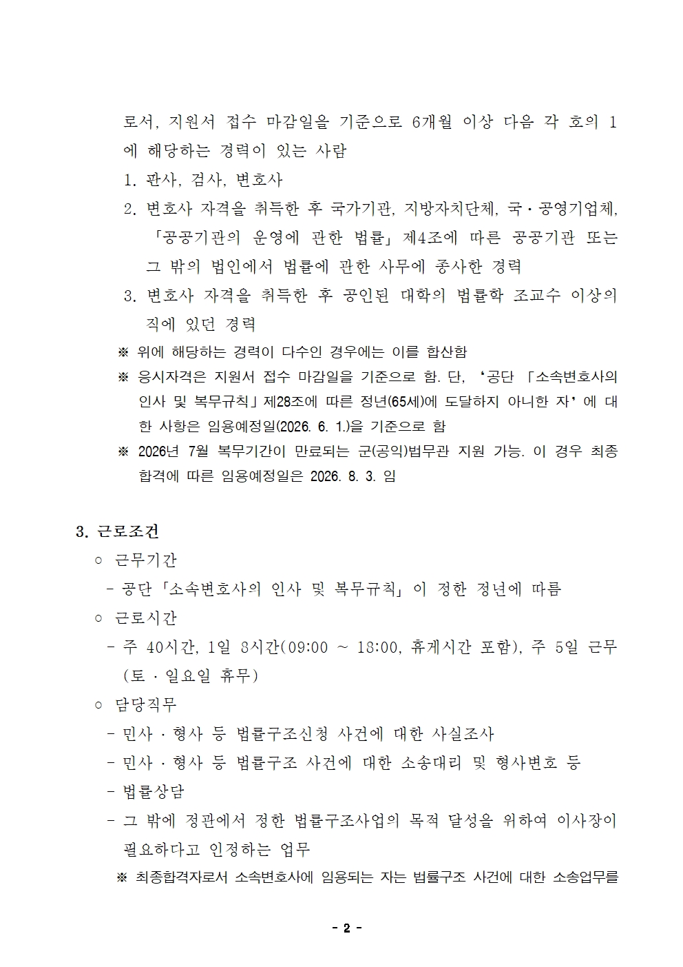 ※ 응시자격은 지원서 접수 마감일을 기준으로 함. 단, ‘공단 「소속변호사의 인사 및 복무규칙」제28조에 따른 정년(65세)에 도달하지 아니한 자’에 대한 사항은 임용예정일(2026. 6. 1.)을 기준으로 함