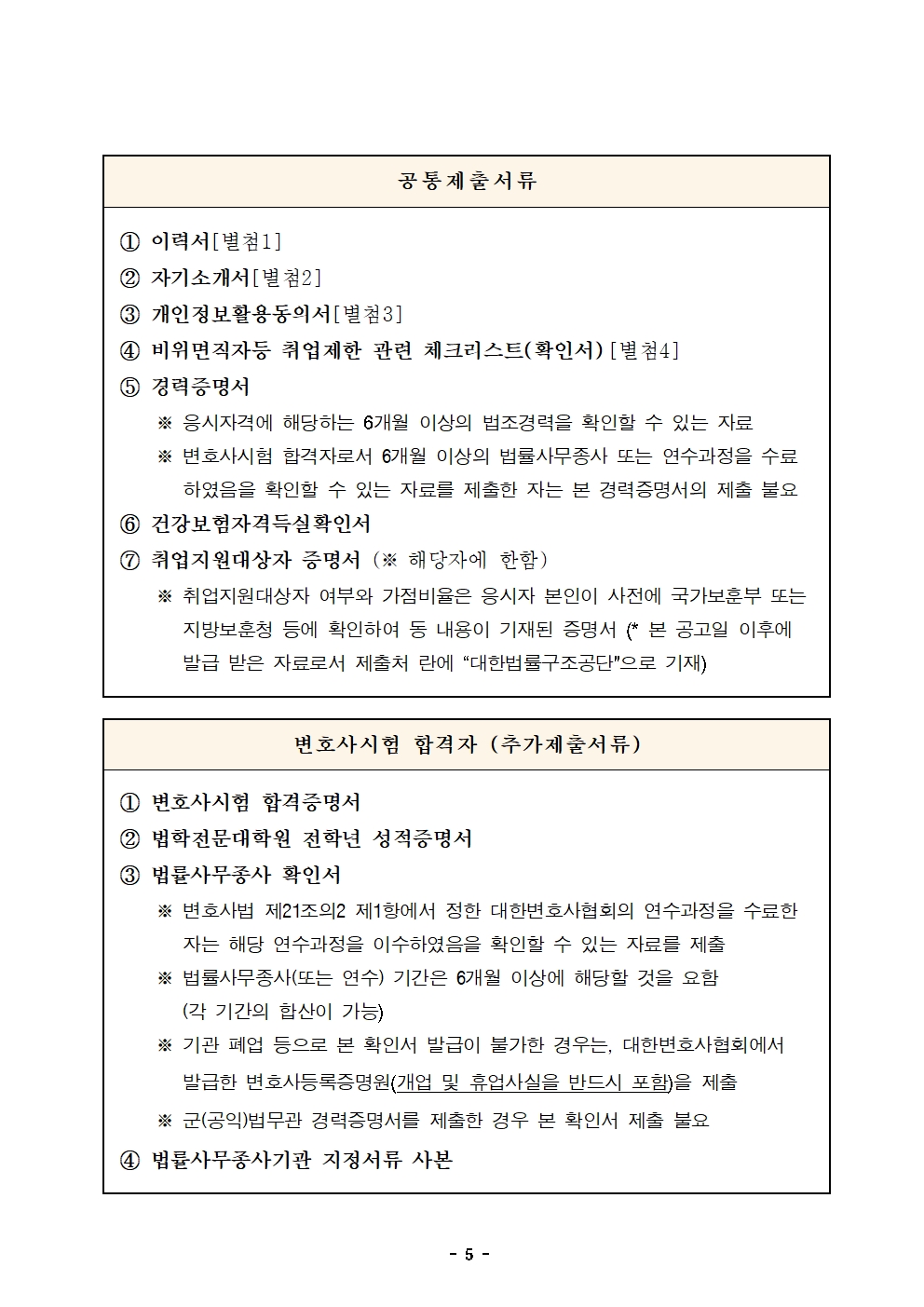 나. 변호사법 제4조 제1호 또는 제2호에 따른 변호사 자격이 있는 자로서, 지원서 접수 마감일을 기준으로 6개월 이상 다음 각 호의 1에 해당하는 경력이 있는 사람
