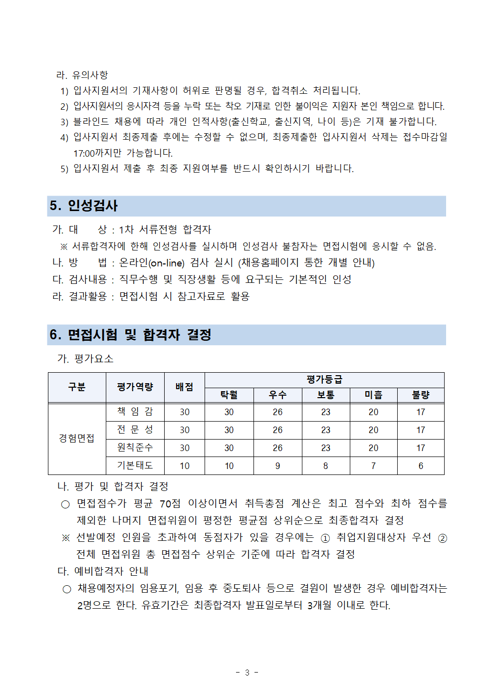 - 심사 방법: 서류전형 ➔ 인성검사 ➔ 면접전형