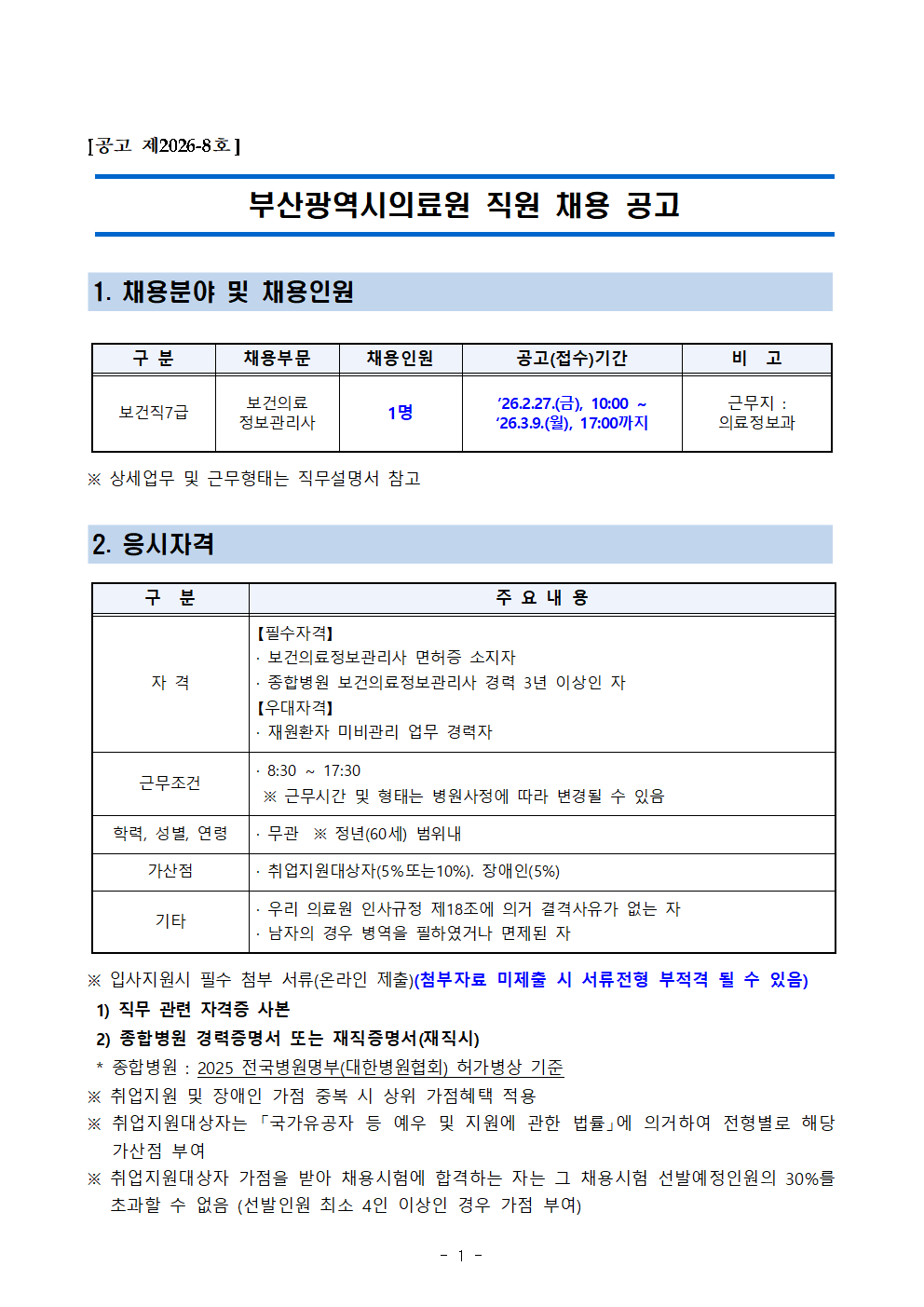 - 모집 분야: 보건·의료 (의무기록 및 보건의료정보관리)